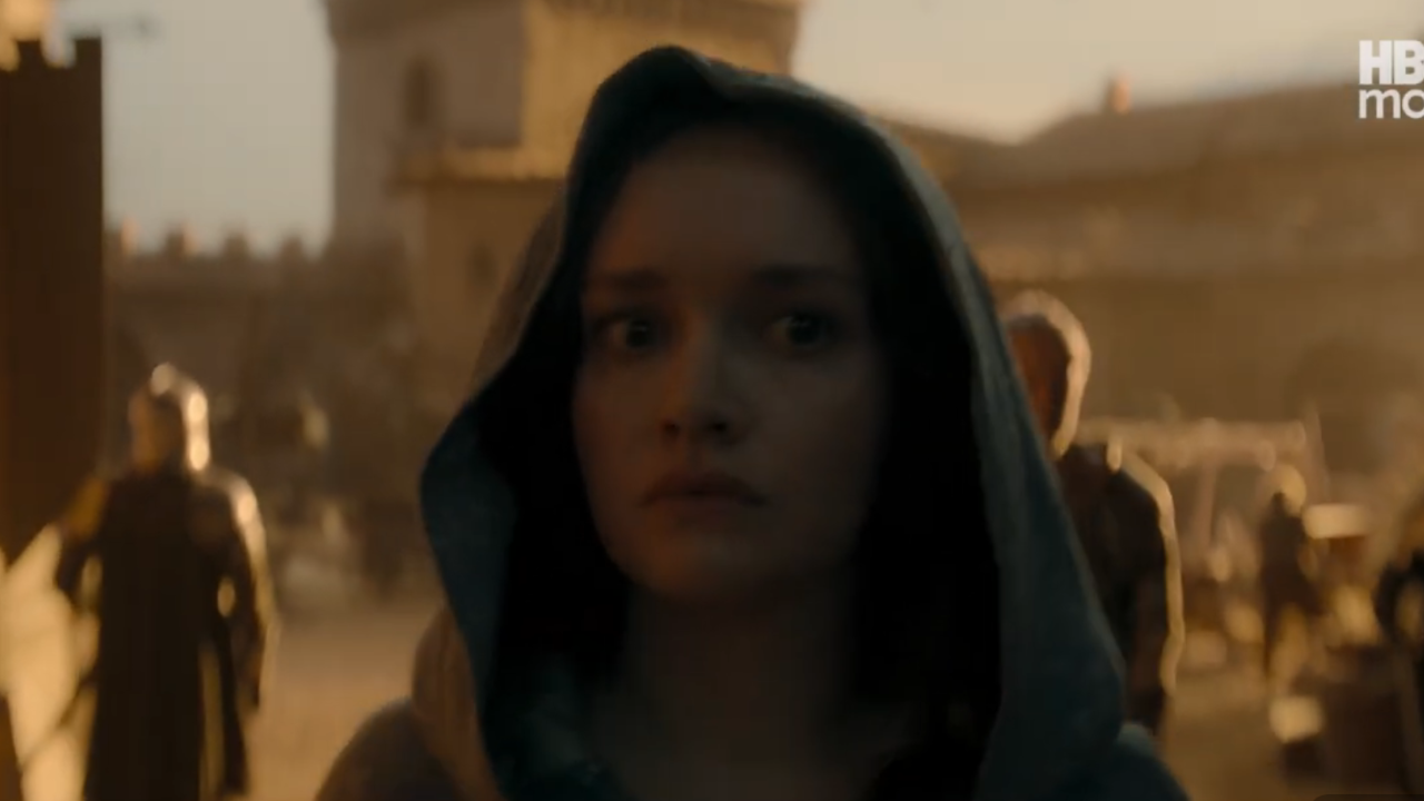 El trailer comienza con Alicent encapuchada en Desembarco del Rey: asumimos que la escena tiene lugar nada más después de volver de Rocadragón al final de la segunda temporada.