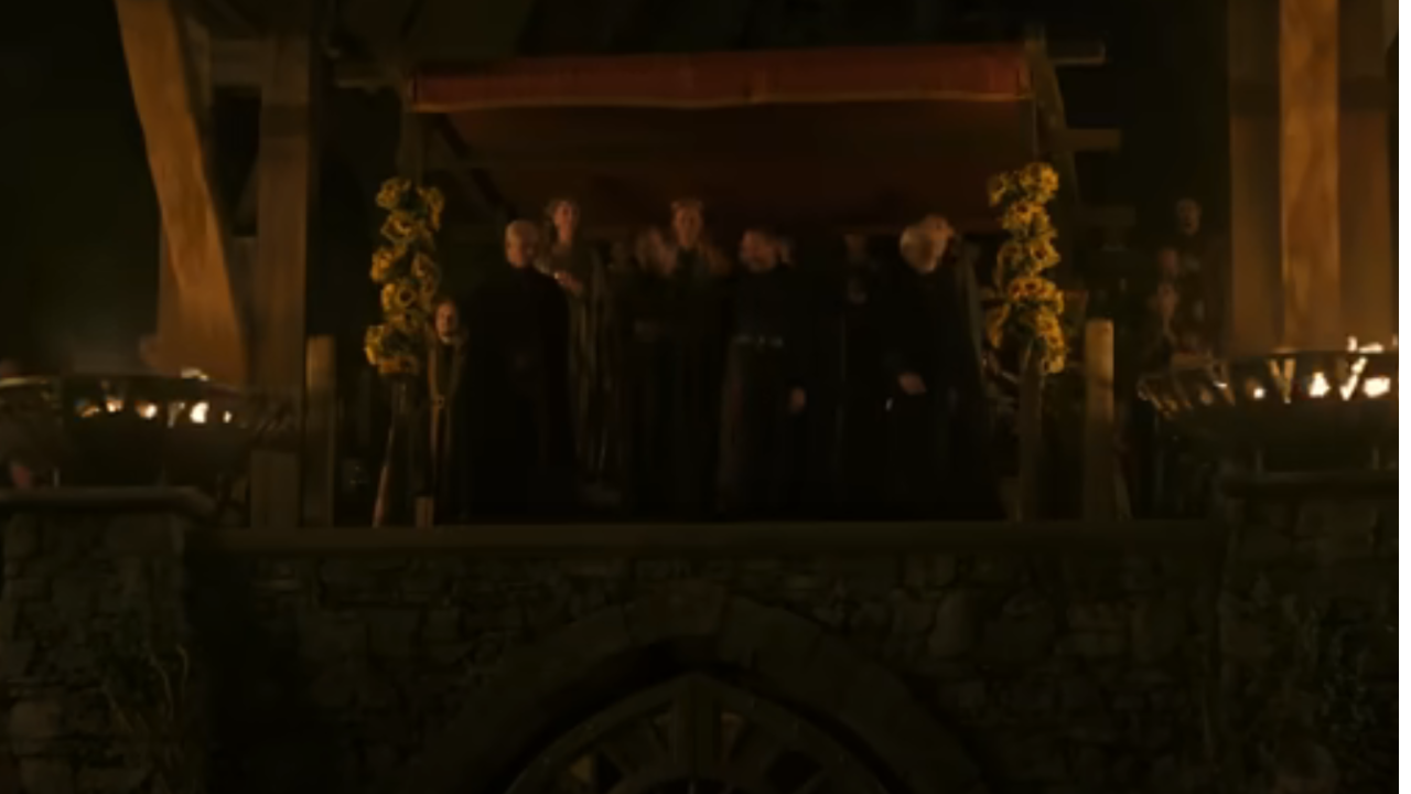 La siguiente imagen es de las más curiosas: un funeral. No tenemos dudas de que es del príncipe que debió reinar; y en primer plano tenemos a su hijo, Valarr Targaryen, y su prometida, Kiera de Tyrosh, con su pelo rosa. Un detalle curioso es que en los libros nunca se menciona este color de pelo tintado, propio de esa Ciudad Libre, sino que la serie lo ha adoptado de las imágenes de la Wikia del personaje.