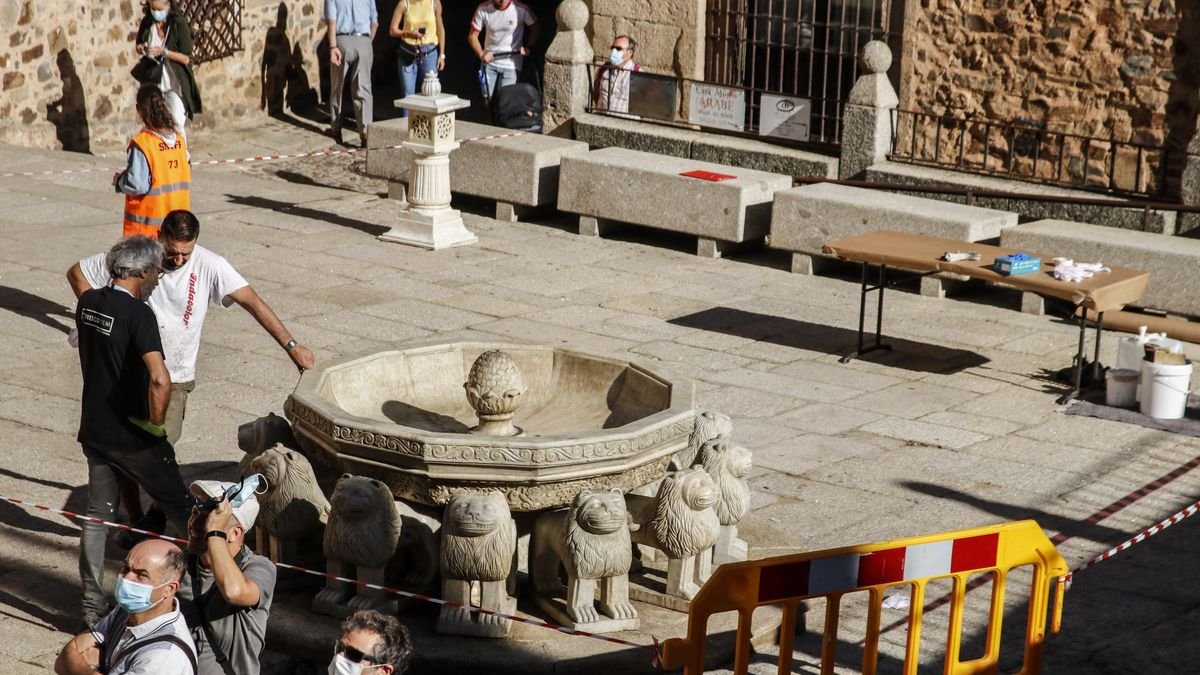 Los extras de hoy, viendo imágenes de El diario de Extremadura, pensamos que probablemente sean habitantes del Lecho de Pulgas. Lo que nos sigue llamando la atención es la enigmática fuente de los leones, coronado con una piña. Especulamos, sabiendo que había material para las habitaciones de Alicent, que podría ser un patio privado de la reina. Y un lugar donde, por los candelabros e iluminación, quizás se grabe una escena nocturna.