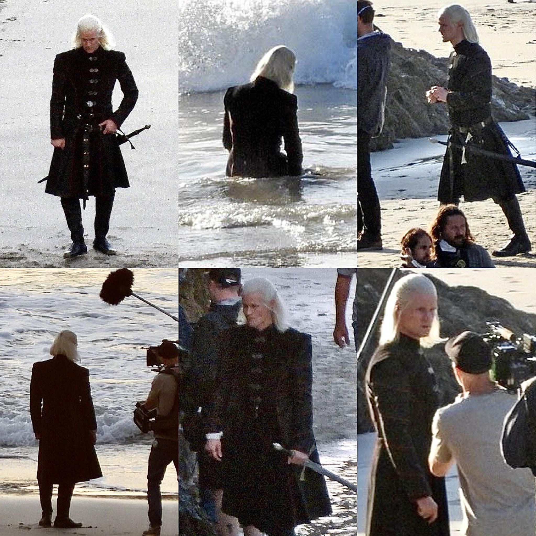 La primera escena que nos llama la atención es la de un Daemon Targaryen, interpretado por Matt Smith, herido junto a la playa. Gracias al Daily Mail vemos que tiene su espada de acero valyrio, la legendaria Hermana Oscura, clavada a su lado. En otras instantáneas vemos que está bien, y casi parece un dolor más emocional y mental tras la batalla de los Peldaños de Piedra…o una mala noticia.