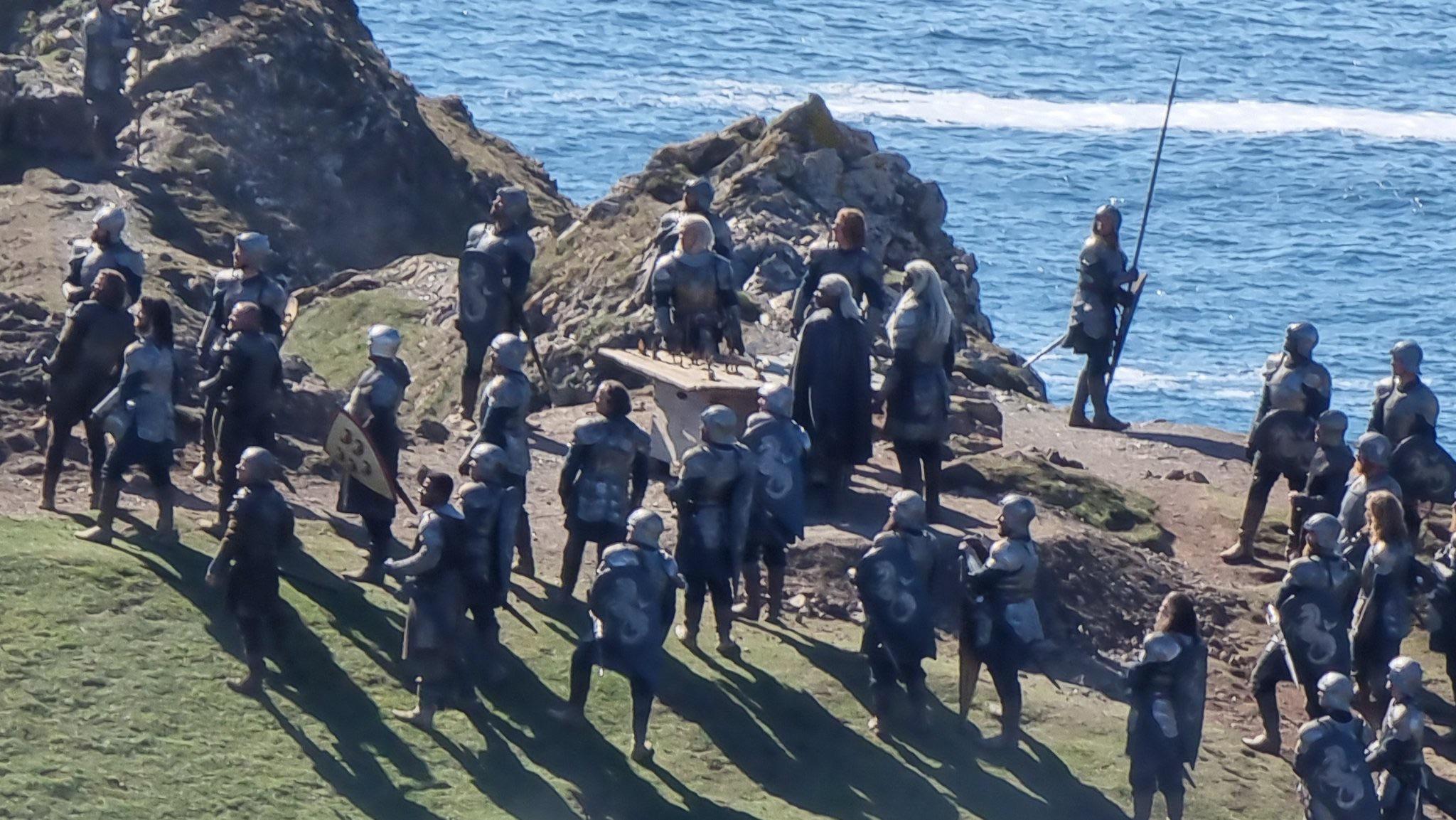 La siguiente imagen muestra lo que parece un consejo de guerra junto a la costa. Vemos a Corlys Velaryon, a Daemon Targaryen y algún Velaryon más sin identificar. Están observando un dron: en vídeos desde el set se ha podido comprobar que representa un dragón.