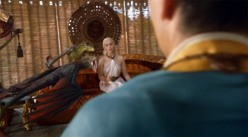 En segundo lugar, la conversación me ha parecido muy interesante. Dan por reales los dragones de Daenerys, pero Tywin argumenta que como los últimos eran muy pequeños estos serán del estilo, por lo que no hay que preocuparse. Me parece un argumento sólido, sobre todo teniendo en cuenta que lo hace un hombre que está lidiando un par de guerras y que tiene que tranquilizar a un fácilmente alterable rey, no sea que le de por enviar medio ejército al otro lado del mundo.