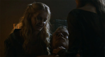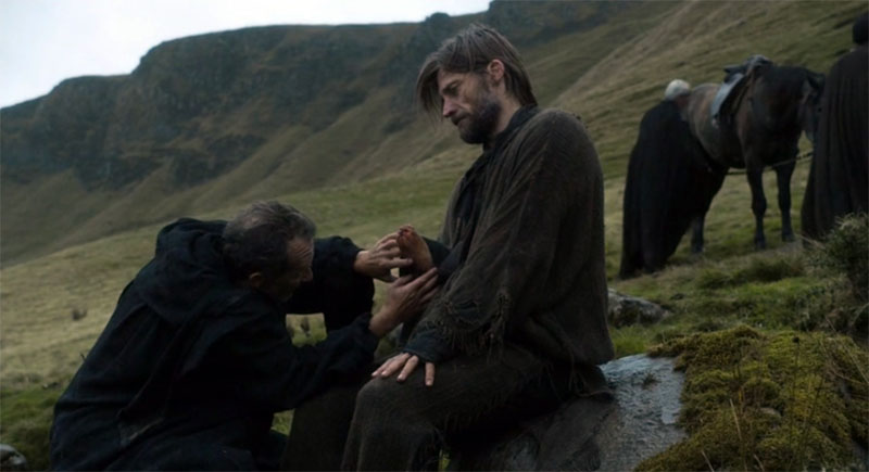 En Harrenhal hay importantes movimientos, y fieles al libro en su medida. Lord Bolton se marcha a la boda de Edmure, y deja el castillo en manos de Locke, al que pronto darán una lección de su propia medicina (¿la vereremos?). Jaime se marcha como es debido, y a mitad de camino se arrepiente y hace volver a la comitiva, entre la que vemos a un buen interpretado Qyburn.