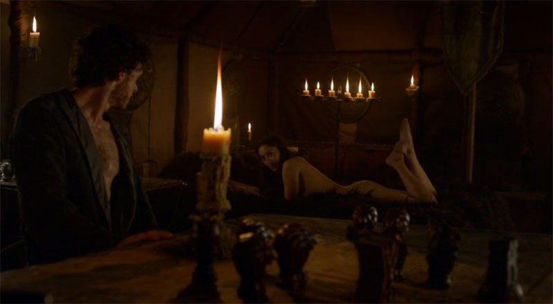 Cerramos la trama del Norte con otra aparición estelar del nuevo sádico líder de la pantalla, adelantando a Joffrey desde hace varios capítulos, Ramsay. Esta vez, además, nos confirman una duda que teníamos en los libros, y que debatimos largamente en el foro sin llegar a conclusiones ¿le han cortado la virilidad a Theon? Pues parece ser que sí, y como no podía ser de otra forma, con jueguecito incluido (y escena de sexo, claro).