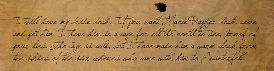 Por otra parte creo que Mance Rayder lo tiene peor. Quizás se trate de una estratagema de Ramsay, pero en la carta, el bastardo da una información que es imposible que tenga a menos que haya «interrogado» a alguno de los infiltrados en su boda con la falsa Arya. Quizás no sea el propio Mance, si no una de las mujeres de las lanzas, pero desde luego a alguien tiene que haber descubierto para haber obtenido esta información. Por tanto, si la carta no es en su totalidad verdad, lo es al menos en parte.
