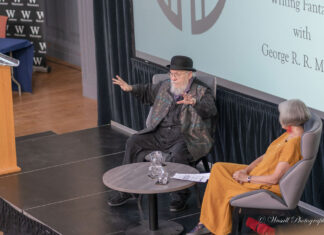 Este verano en Los Siete Reinos hemos estado dos veces con George R.R. Martin: en Oxford y en la Worldcon en Glasgow, cuando incluso cenamos con él. Ya hablaremos del segundo más adelante: lo que vamos a hacer hoy es una crónica de la extraordinaria charla que dio GRRM en el Sheldonian Theatre de Oxford en que habló de fantasía, magia el avance de Canción de hielo y fuego y spinoffs de Juego de Tronos.