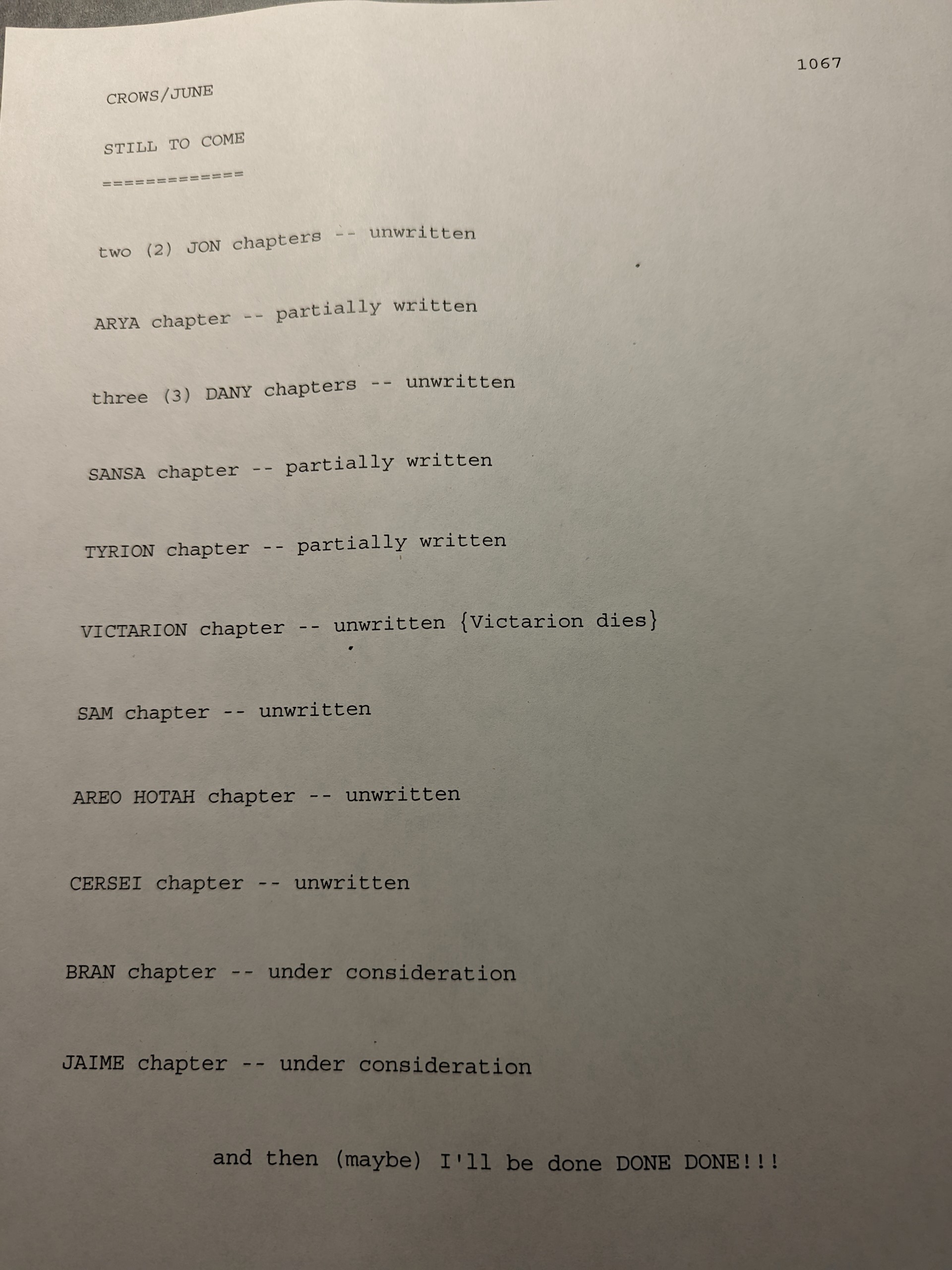 Parte de las razones de esto es por el segundo cambio significante que descubrí en ese manuscrito. Este no es prosa, sino una de las páginas que George inserta originalmente en sus borradores para los capítulos que ha planeado pero que no ha escrito todavía. Así es la última página del borrador de Festín de Cuervos de junio de 2004: