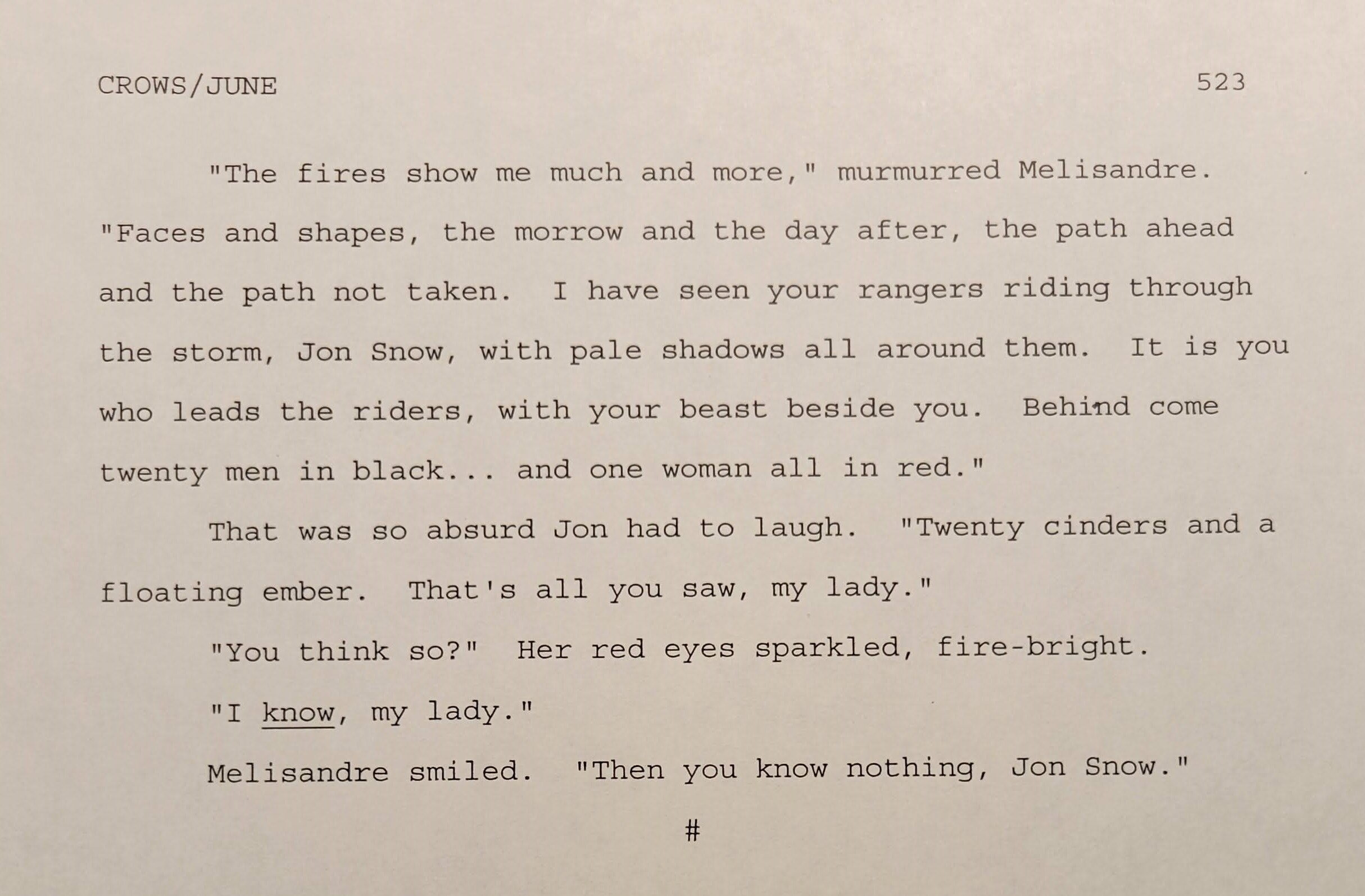 Digo esto en parte porque el manuscrito contiene un presagio de Melisandre que George borró completamente. Echemos un ojo a una visión pequeña de Melisandre que fue borrada del libro definitivo. Esta es de la reunión entre Stannis y Jon en el que el bastardo aconseja al rey atacar Bosqueespeso, que aparece en la versión publicada en Jon III de Danza.