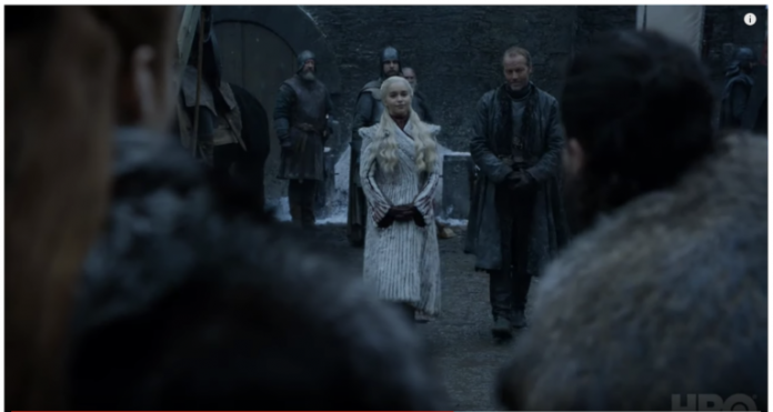 En él podemos ver a Sansa, Daenerys y Jon (entre otros) en Invernalia, en lo que parece una conversación un poco tensa. Aunque solo podemos escuchar una línea de diálogo, en principio amable, (Sansa: «Invernalia es suya, alteza») el lenguaje no verbal parece que dice otra cosa.