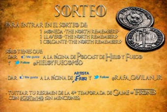 Pero esto no es todo. Una semana más, el Podcast de Hielo y Fuego quiere premiar vuestra fidelidad, y para ello se ha organizado un nuevo sorteo con Artista Friki, esta vez basado en el concepto The North Remembers. En la siguiente imagen podréis descubrir cómo ganar una de las monedas (suelta, en llavero o en colgante) que regalarán entre los que cumplan las condiciones expuestas: ser fan del Podcast y de Artista Friki en Facebook y Twitter y hacer tu resumen de la 4ª temporada en 140 caracteres.