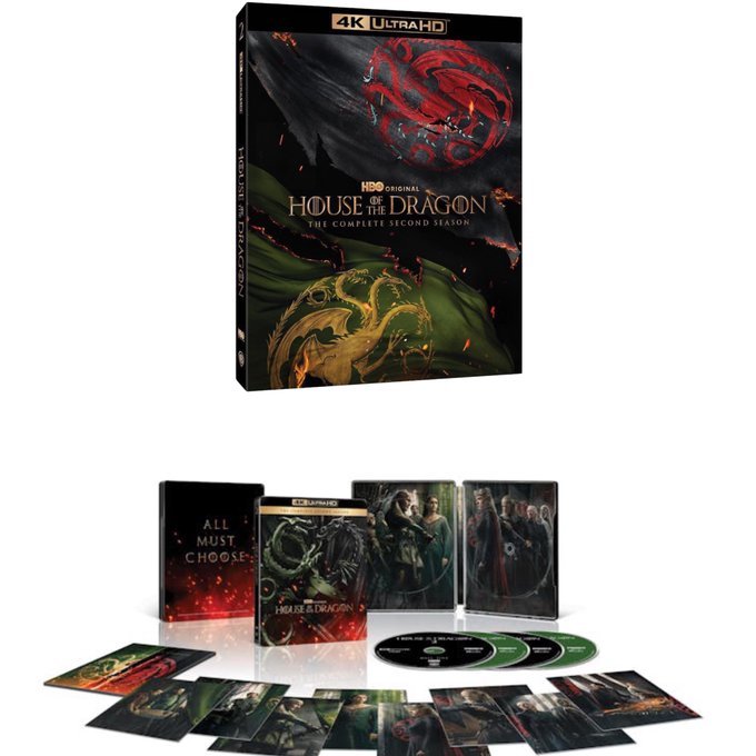 El Blu-Ray de la segunda temporada de La Casa del Dragón se ofrece en formato estándar Blu-ray sencillo, en un combo UHD 4K y Blu-ray y la edición de lujo, el Steelbook de La Casa del Dragón en UHD 4K. La edición metálica y en 4K incluye 8 postales de personajes.