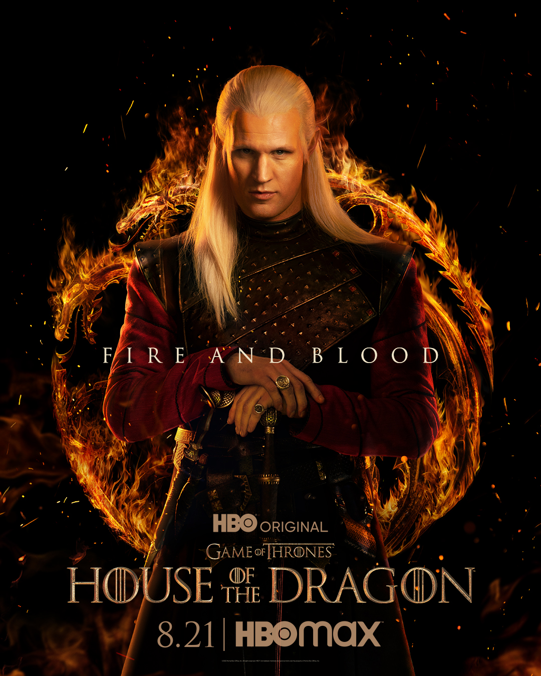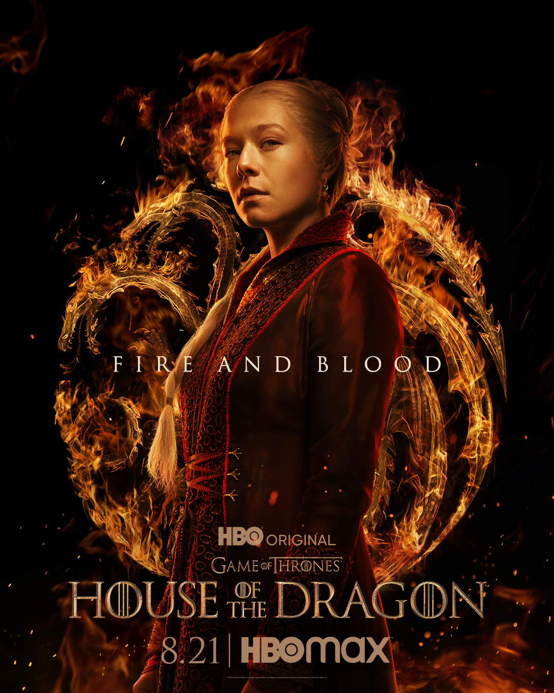 Y a partir de ahí ha llegado una catarata de posters oficiales de personajes. La primera imagen mostraba a la propia Rhaenyra Targaryen (Emma D’Arcy), descrita como «primogénita» de Viserys I.