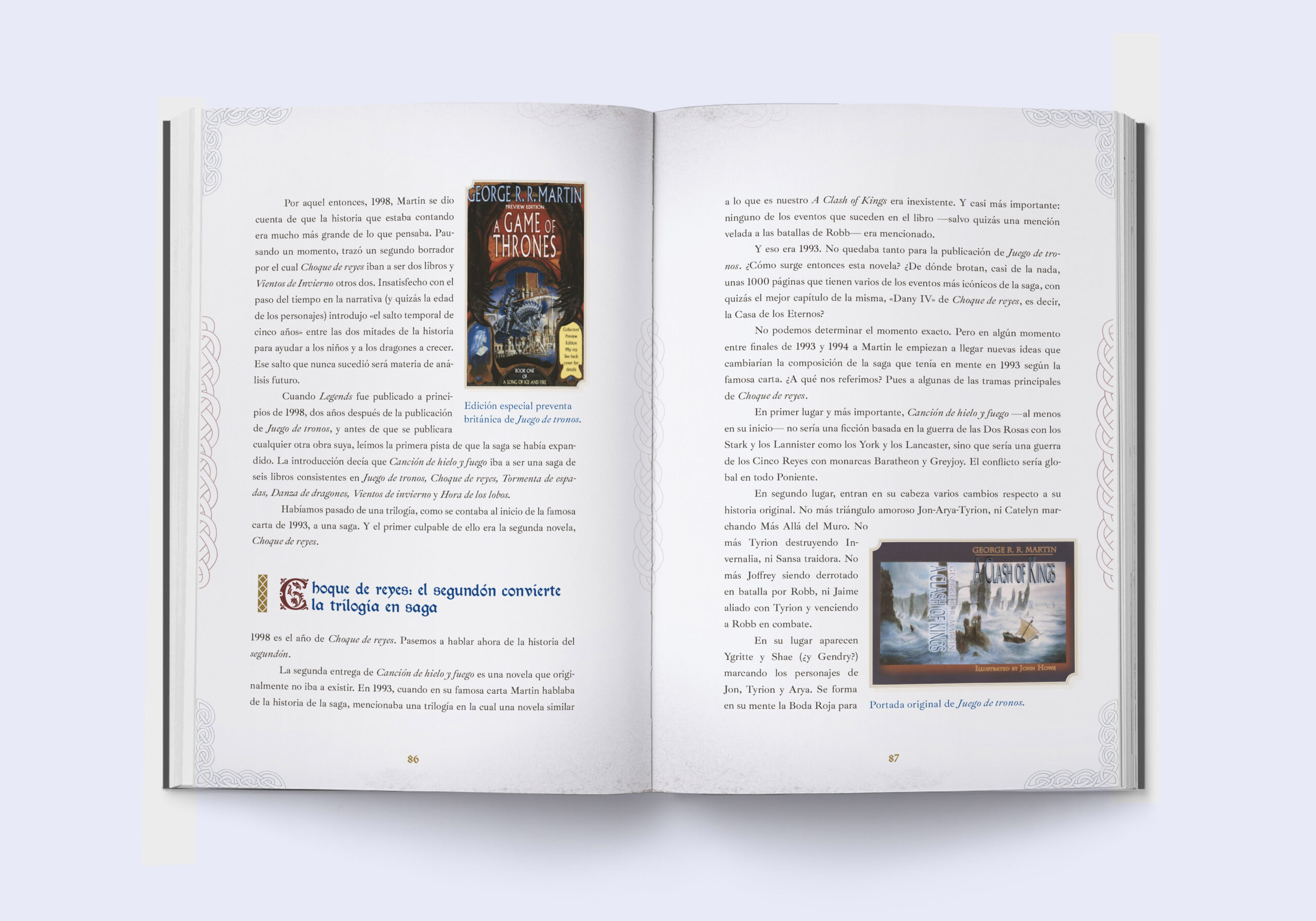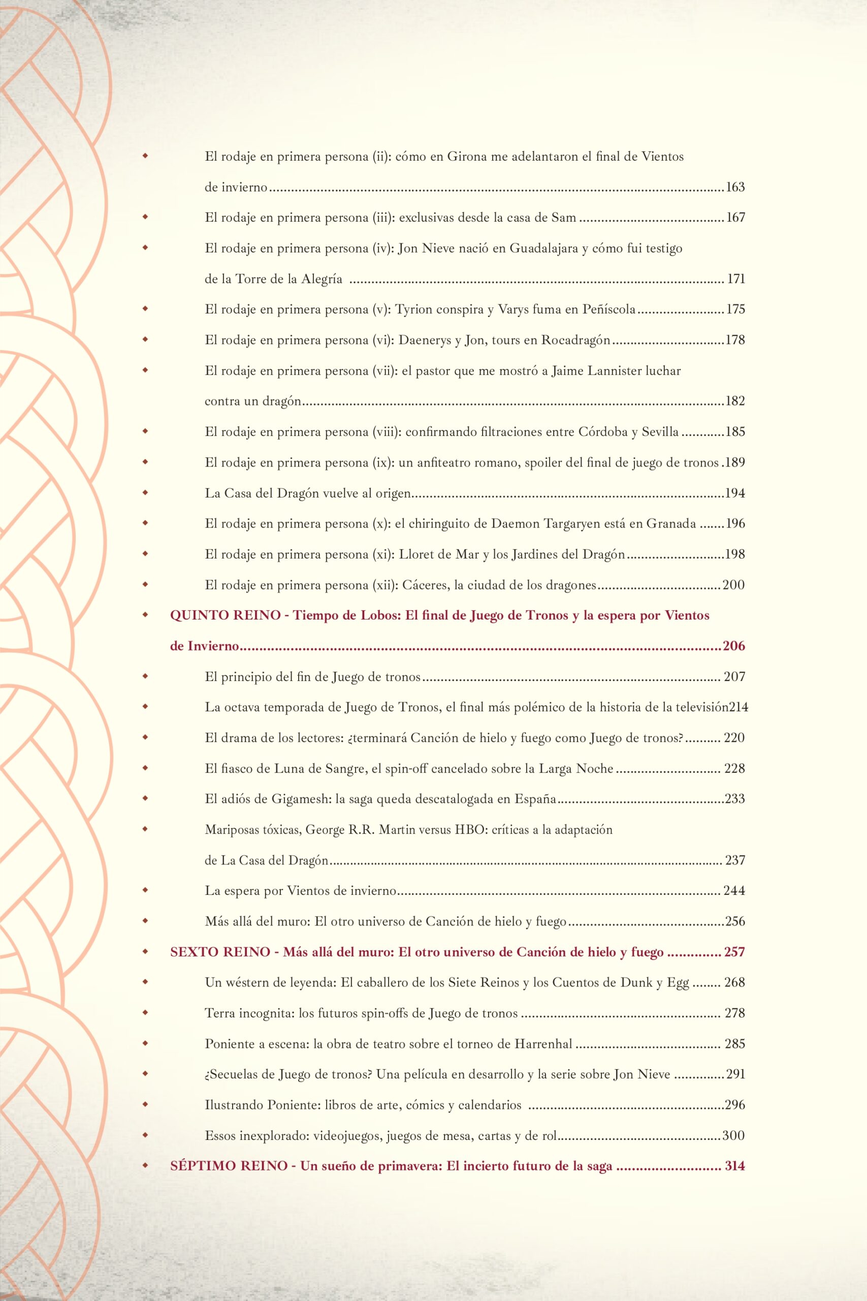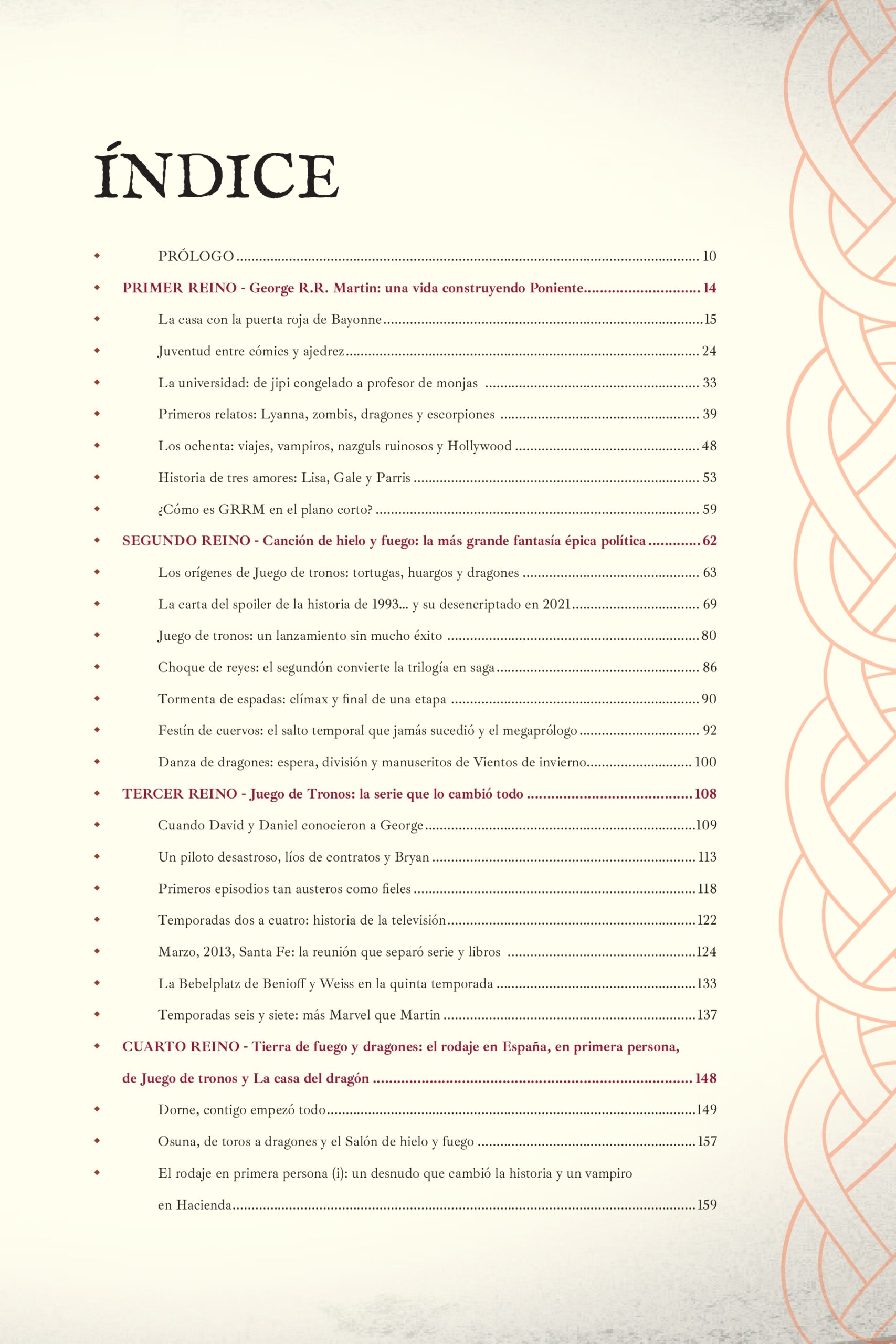¿Qué cuenta el libro? Pues todo sobre la saga. Contiene la primera biografía de George R.R. Martin, desde que nació en Bayonne hasta que cenamos con él el verano pasado. Se añade un compendio de la información sobre la serie Juego de Tronos y los cinco libros publicados de Canción de hielo y fuego, además de teorías y especulaciones sobre las novelas futuras.